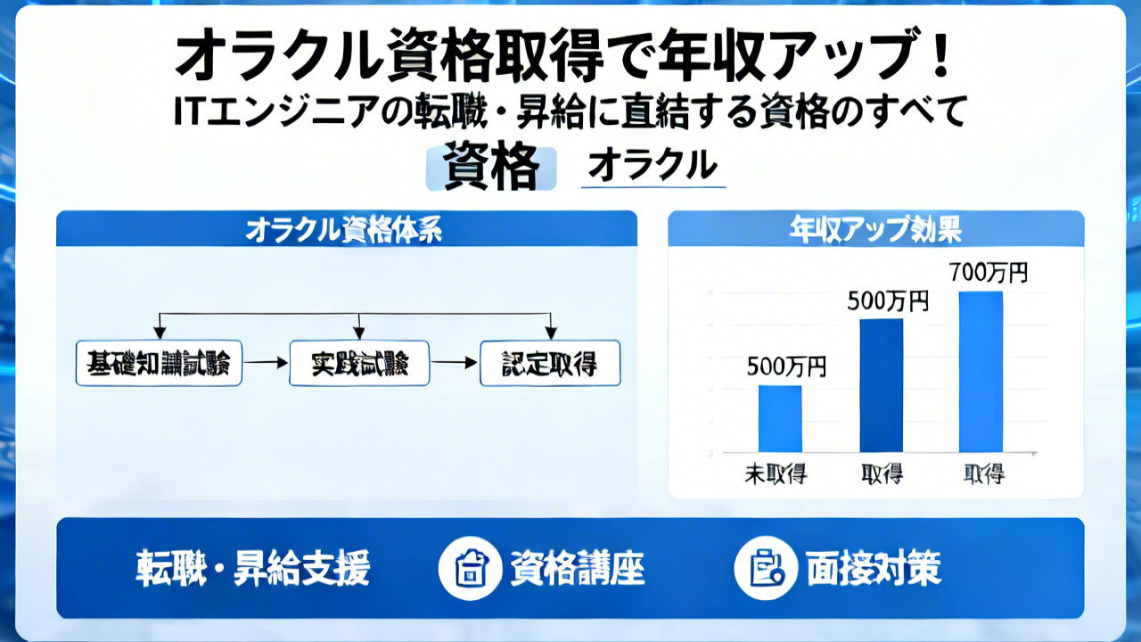 IT業界では「スキルを可視化する」ことが転職や昇給でのアドバンテージに直結します。その中でも「オラクル資格」は、データベース管理やクラウドサービスなどの幅広い領域で信頼性の高いスキル証として認知されて......
